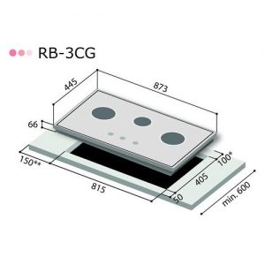 Bếp gas âm Rinnai RB-3CG(B) có thiết kế khổ rộng với mặt kính 873 x 445 x 66 (mm) và kích thước cắt đá 815 x 405 (mm) làm cho không gian nấu nướng thêm rộng rãi và thoải mái hơn.