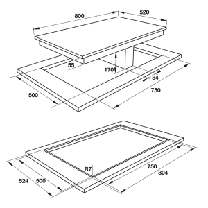 + Kích thước hút mùi: 800R x 520S x 170C mm