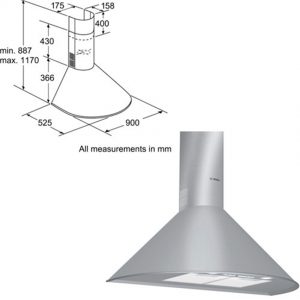 Bosch DWA091450 thuộc dòng máy hút ống khói với thiết kế lắp đặt gắn vào tường có kích thước và công suất hút rất lớn.