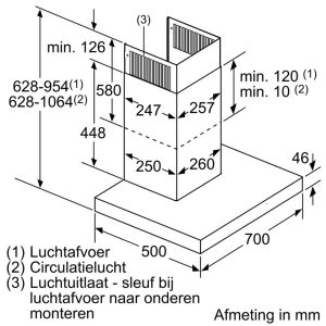 - Kích thước dạng hút thải (CXRxS): 628-954 x 698 x 500 mm