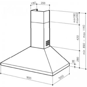 - Kích thước máy hút mùi Hafele 900R x 500S x 890-1140C mm